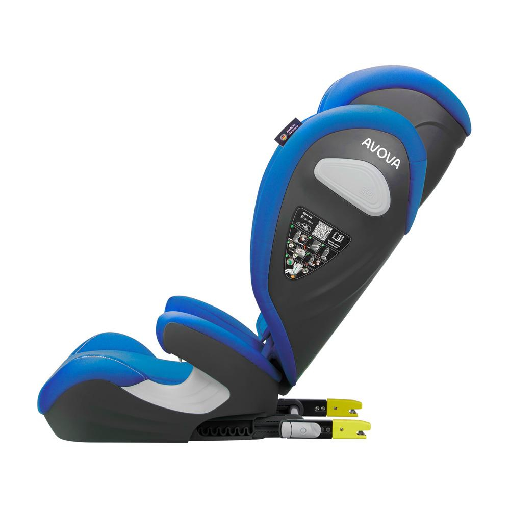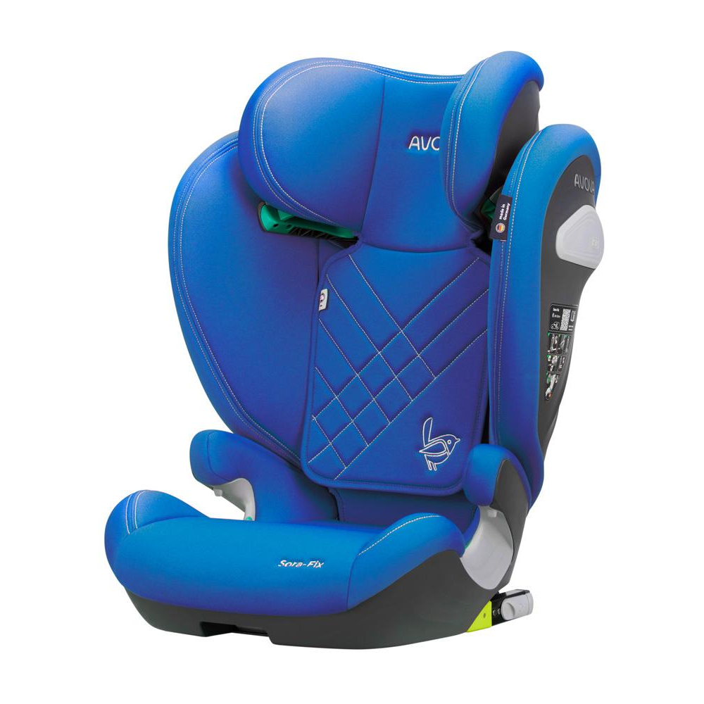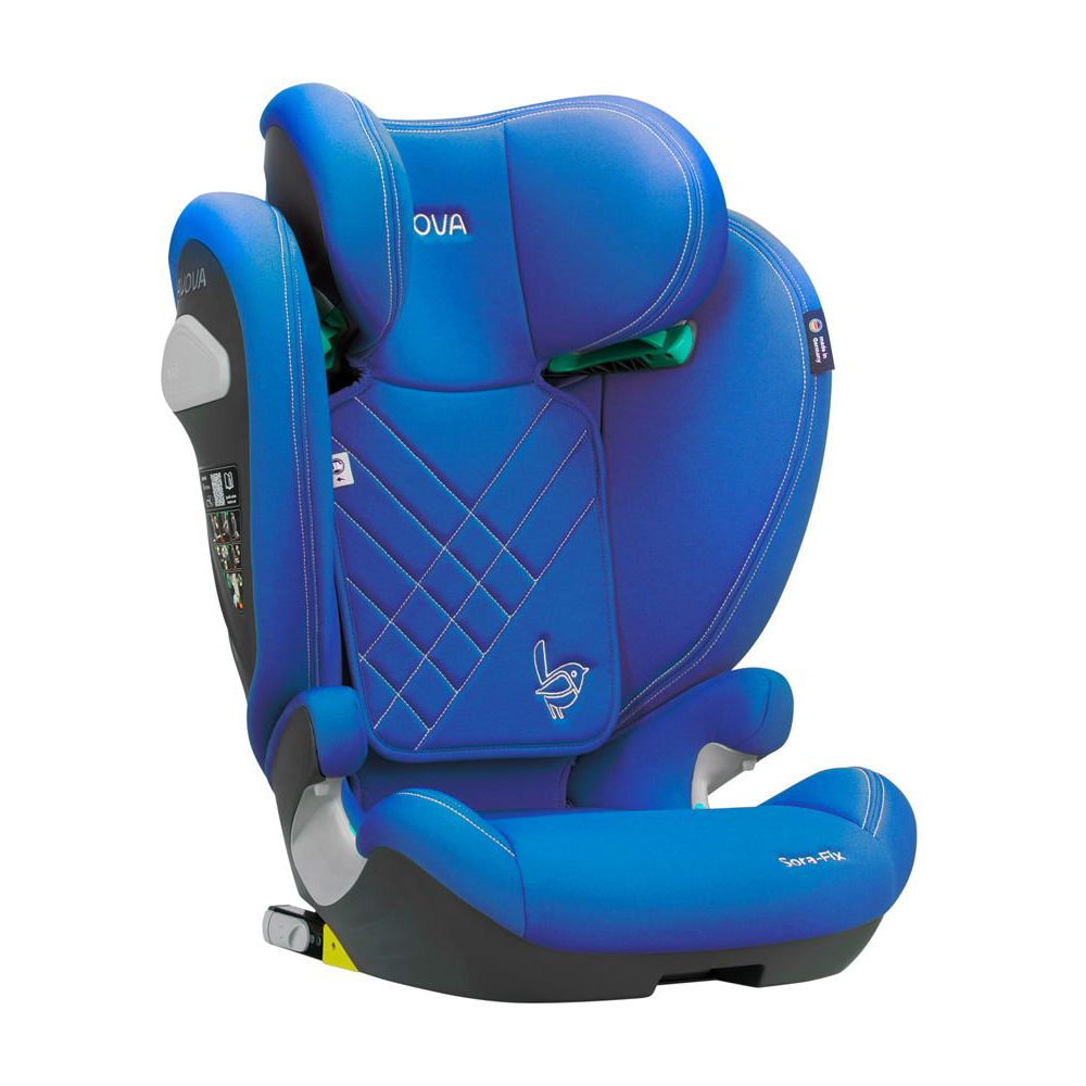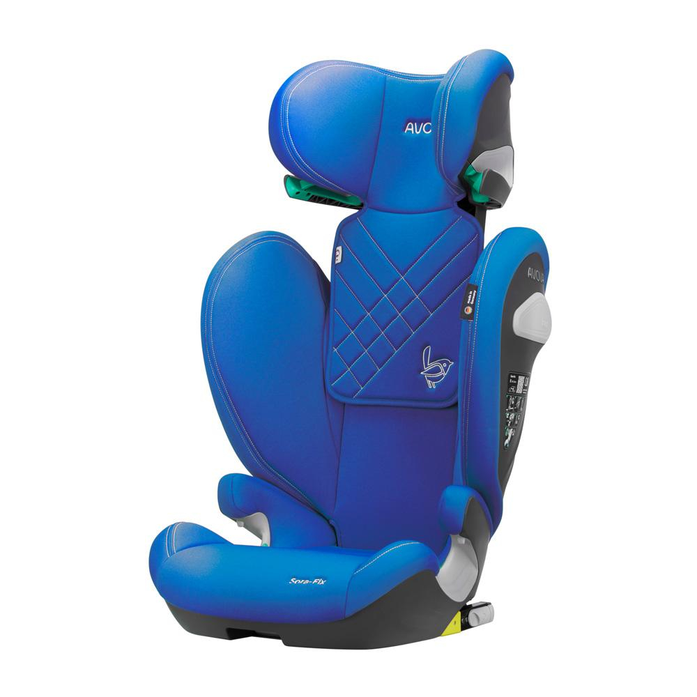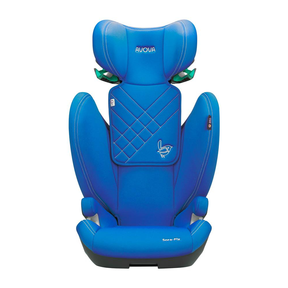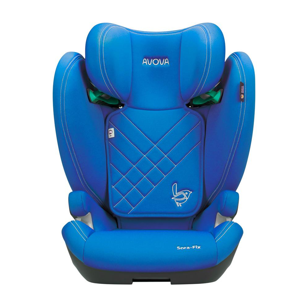 Veselá, pastelově modrá, dětská autosedačka Avova SORA-FIX je schválena podle R-129 pro děti s výškou 100-150 cm, přibližně od 3 do 12 let. Lze ji instalovat po směru jízdy k ISOFIXu vozidla. Vítěz Reddot Design Award 2023.