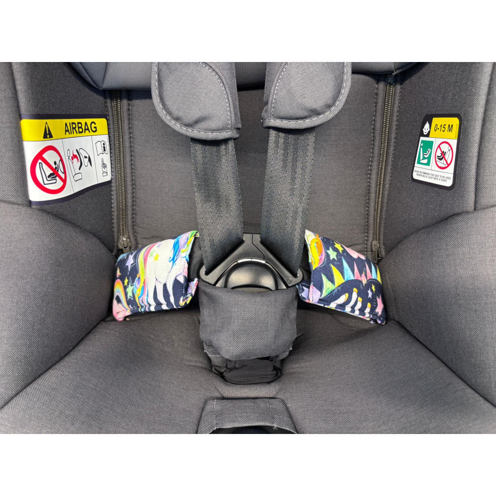 Měkké vycpávky pro zvýšení pohodlí lze nasadit na bezpečnostní popruhy v oblasti boků. Vhodné pro všechny autosedačky s vnitřními 5bodovými pásy.